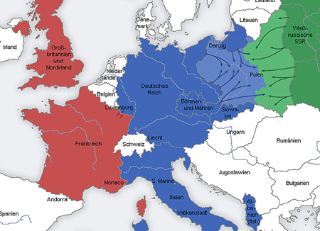 (この地図では、英仏が赤、ドイツ・イタリアが青、ソ連がグリーンです。)