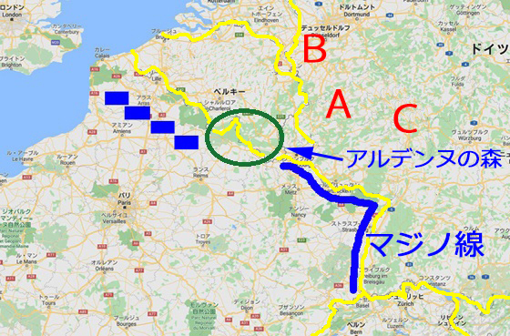 北のマジノ線は次の地図の通り(青い線)です。黄色は国境線です。