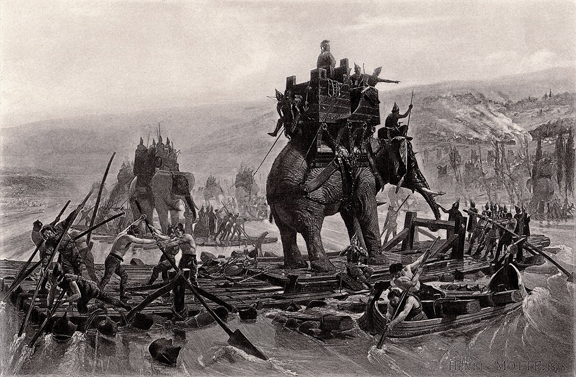 そうしてケルト部族が混乱している間に、筏をつなぎ合わせた桟橋に象を乗せて、