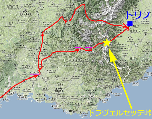 トラヴェルセッテ峠(現在のフランス・イタリア国境)を越えて、トリノに至ります。