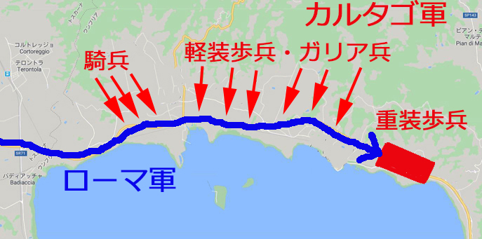 東に向かおうとするローマ軍の頭を押さえてブロックします。