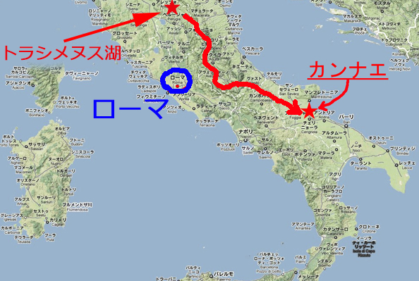破られた軍隊をローマ軍、破った指揮官をカルタゴのハンニバルという。