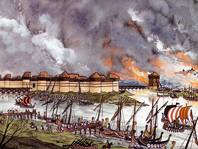 パリのシテ島を包囲するヴァイキング(P. Velay, De Lutèce à Paris.)
