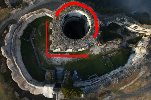 フランス・ガイヤール城 真上から見たところ。主塔は外側が丸く、内側は四角い。