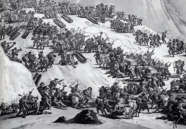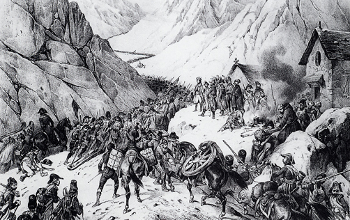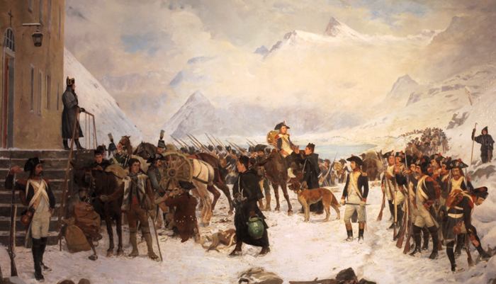 グラン・サン・ベルナール峠の救護所で、峠を越えて行くフランス軍を見守るナポレオン(左上に立つ人物)。