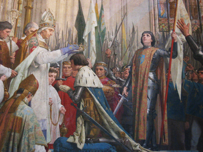 ひざまづいたシャルル7世の頭に、キリスト教会の司教が王冠を載せています。