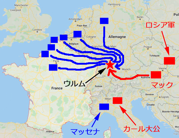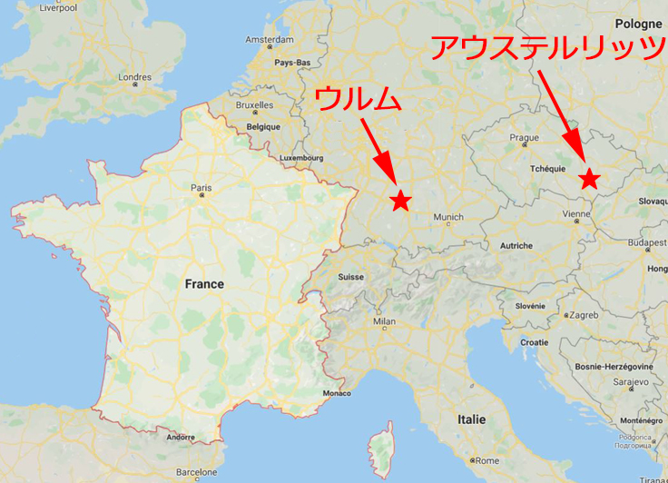 ウルムは今のドイツ南部、アウステルリッツは今のチェコ南東部、オーストリアの