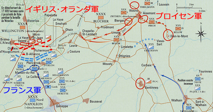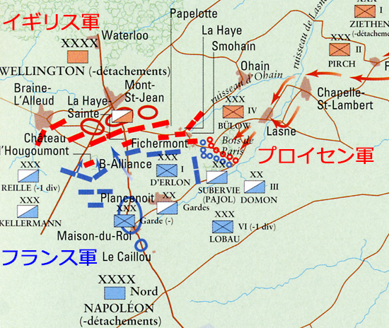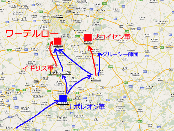 赤が北に布陣するイギリス・オランダ軍、青が南からそれを攻撃するナポレオンのフランス軍です。