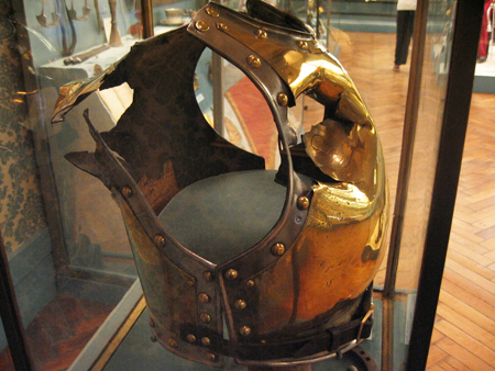 砲弾に貫通されたフランス竜騎兵の鎧(パリ・アンヴァリッド軍事博物館、2003.9.4)